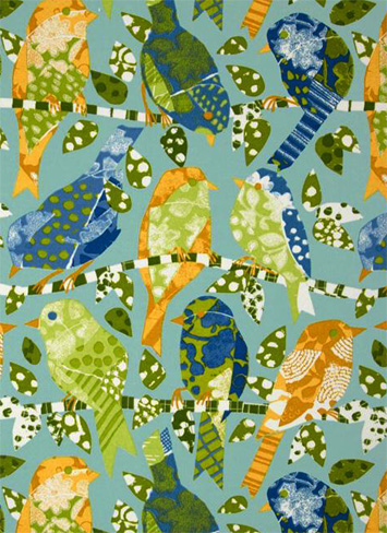 Cute patchwork birds in lovely fresh colours sing against a sky blue background. 137cm wide. IN STOCK FOR SPEEDY DELIVERY.