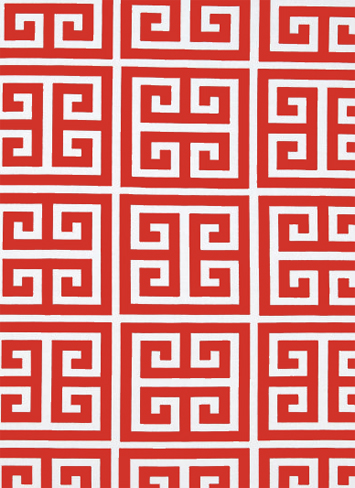 Greek key pattern in salmon red on a white background. 137cm wide. IN STOCK NOW